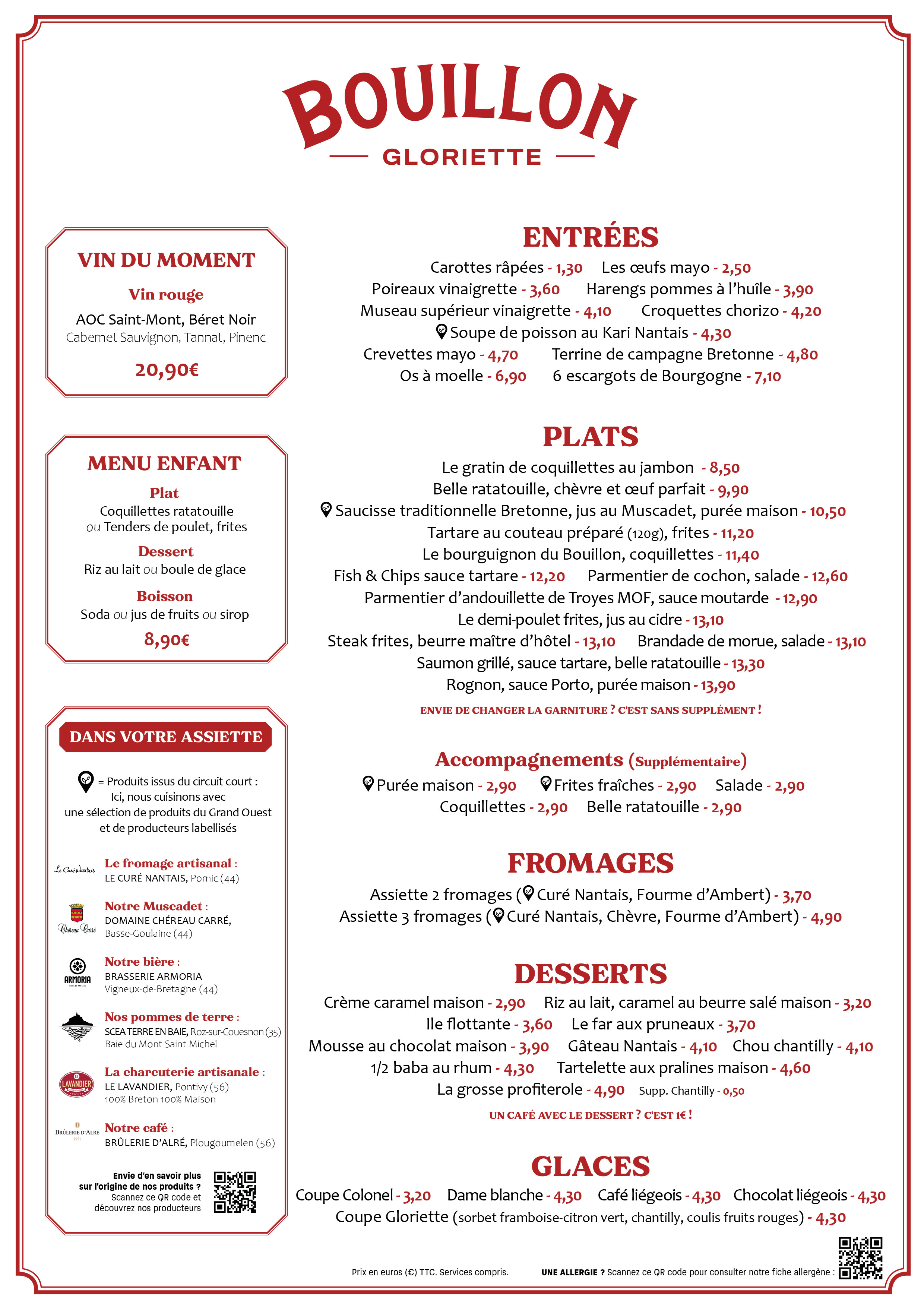 Situé au 11 quai de la Fosse, entre le quartier Bouffay et l'île de Nantes, Bouillon Gloriette vous invite à redécouvrir la cuisine française traditionnelle à travers des plats simples et authentiques, inspirés des célèbres bouillons parisiens.