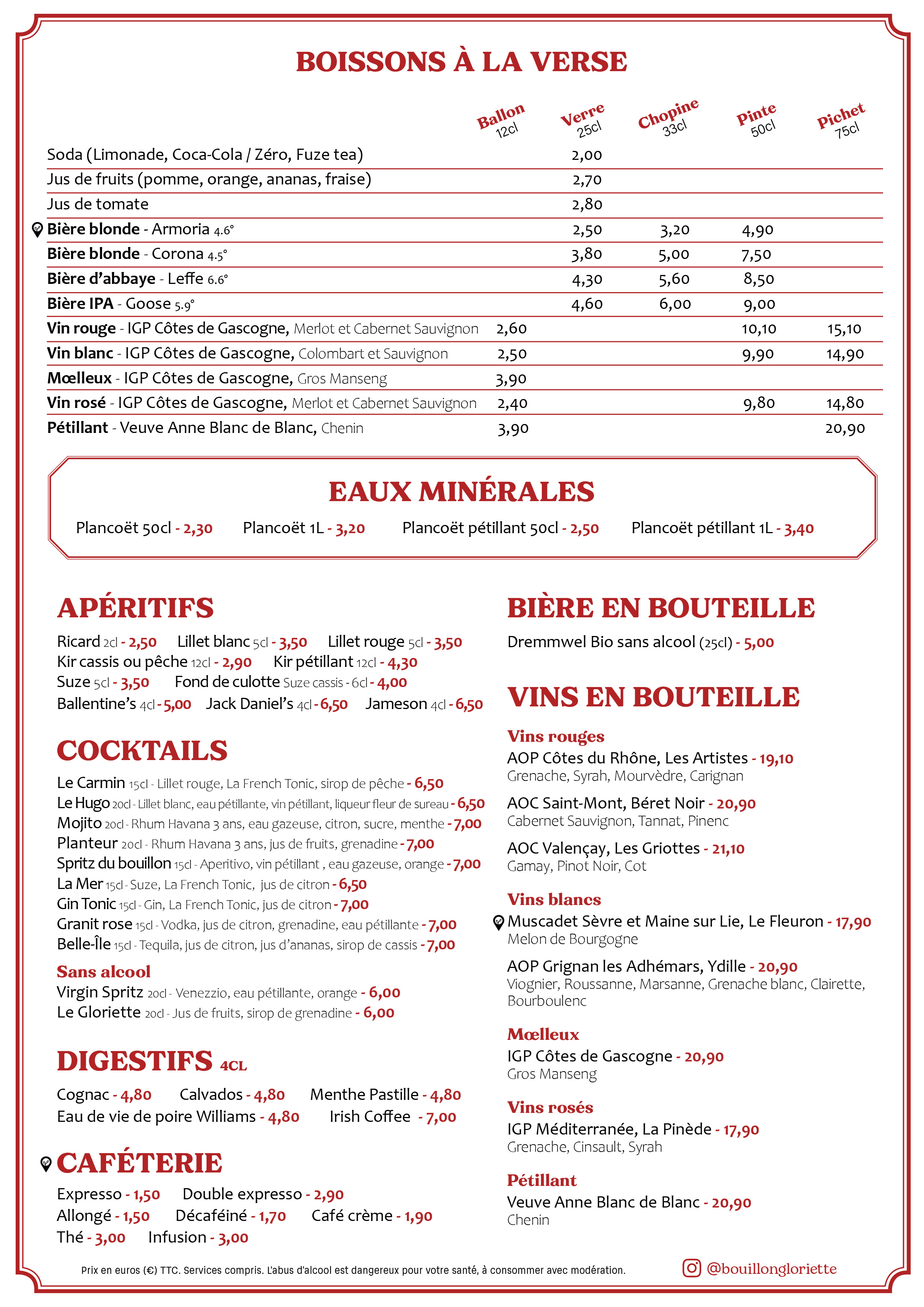 Une cuisine populaire par excellence, avec des recettes réconfortantes des grands classiques français. Chez Bouillon Gloriette, découvrez des plats dès 8,50 €. Ici, la tradition se déguste sans compromis sur la qualité, avec des prix accessibles à tous.